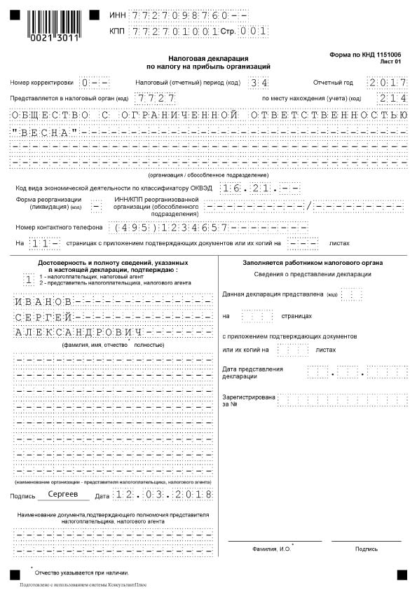 Скачать образец заполнения декларации по налогу на прибыль в формате .xls