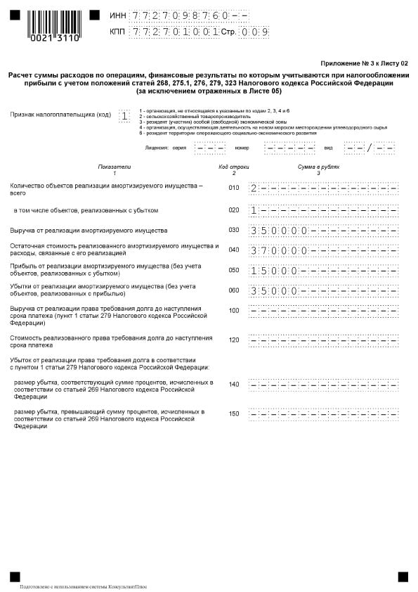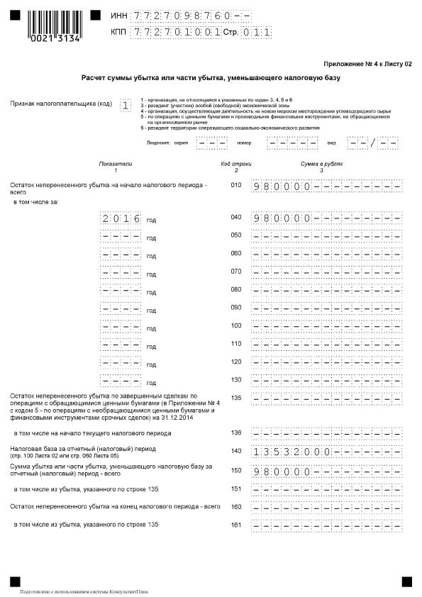 - Строка 110 листа 02, строки 010, 040–130, 150 приложения № 4. При этом сумма убытка, уменьшающего базу, в строке 150 не превышает 50% суммы в строке 140