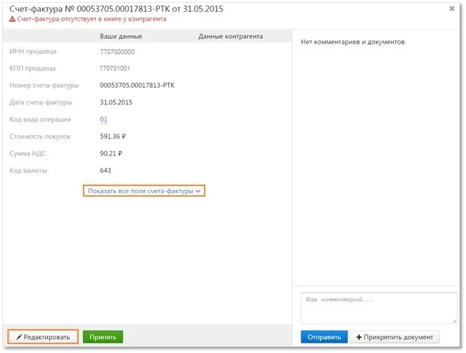 1. Появилась возможность редактировать счета-фактуры с расхождениями в сервисе — достаточно открыть счет-фактуру, нажать кнопку «Редактировать»: