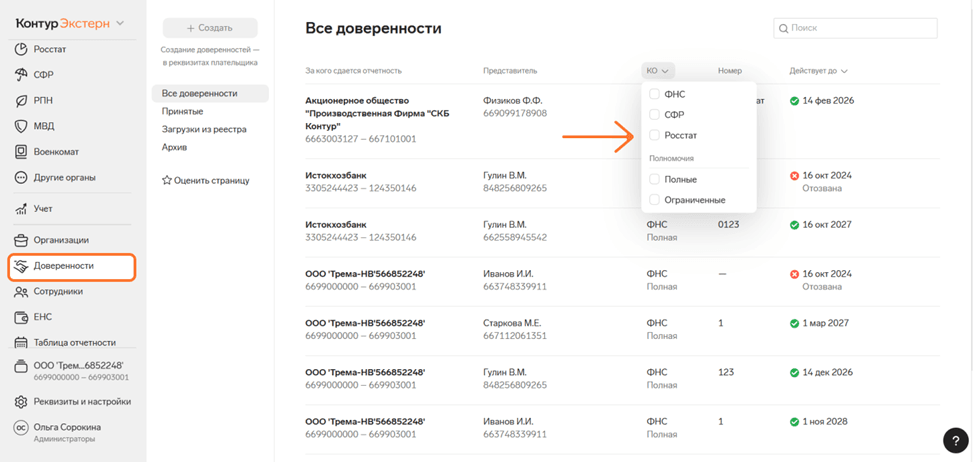 - В столбце «КО» выберите «Росстат» — в списке отобразятся все оформленные доверенности.