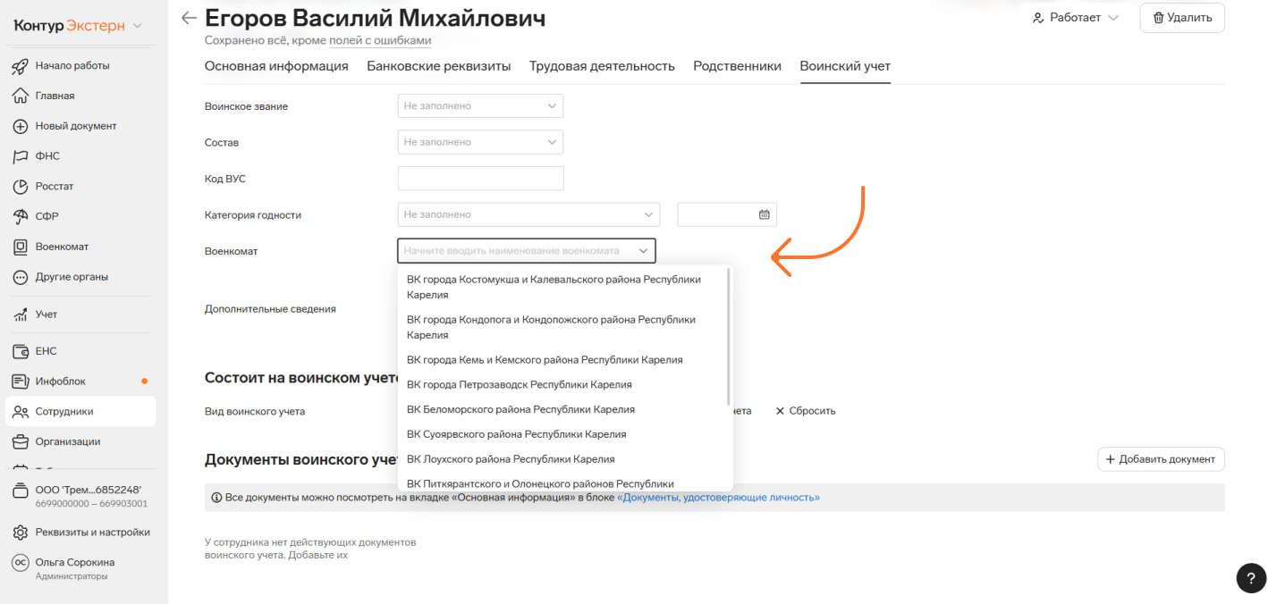 В разделе «Сотрудники» Контур.Экстерн появился встроенный справочник военкоматов. Теперь при заполнении карточки воинского учета данные военкомата можно не вводить вручную — достаточно выбрать нужный вариант из списка.