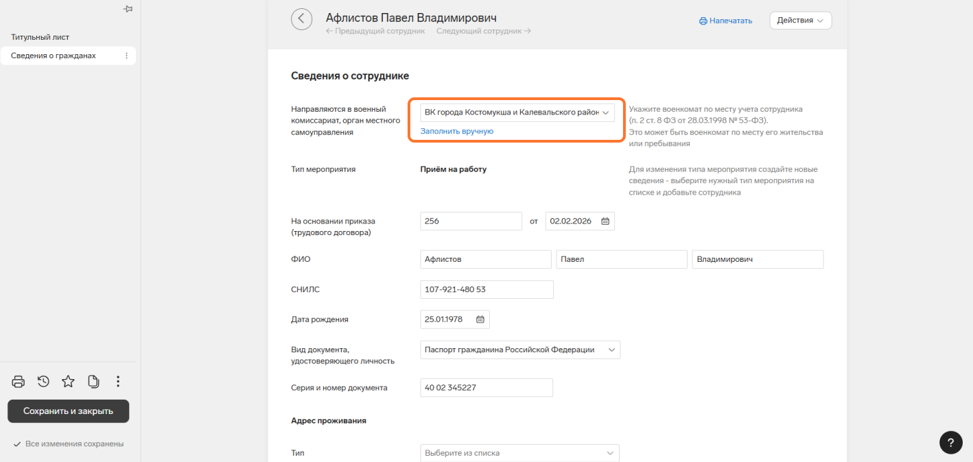 Кроме того, когда вы заполняете сведения о приеме и увольнении сотрудников, указанное название военкомата автоматически сохраняется в справочник. Это помогает быстрее вносить данные и поддерживать единообразие формулировок.