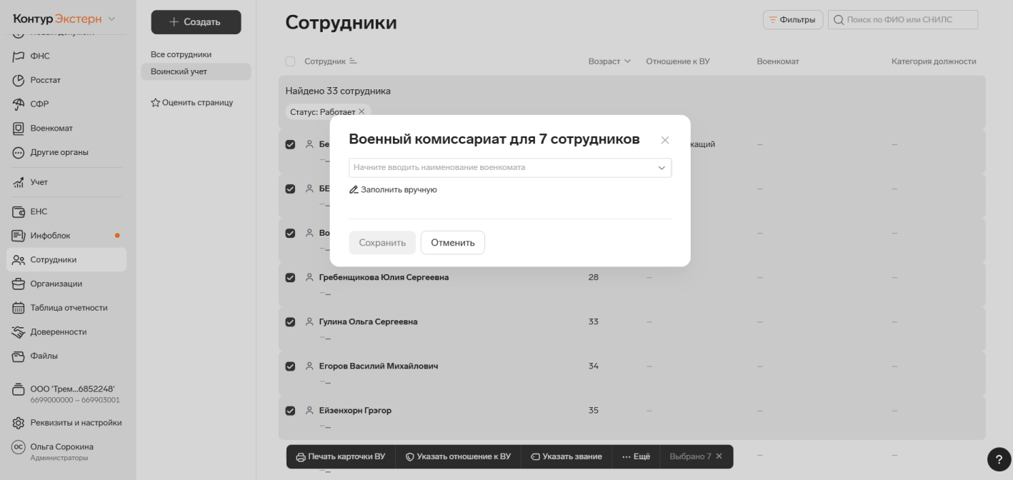 Отметьте галочками сотрудников, для которых нужно указать военкомат. При необходимости примените фильтры.