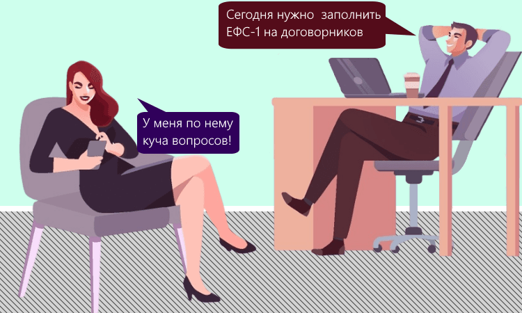 Встречаются и такие случаи: штатный работник, уже оформленный по трудовому договору, в дополнение к этому подписывает с работодателем ещё и гражданско-правовой договор на определённые работы. Реквизиты такого документа тоже надо вписывать в подраздел 1.1 бланка ЕФС-1. Подряд в таких случаях рассматривается отдельно от обычных трудовых отношений, а значит, и в отчётах показывается отдельно.