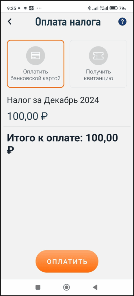 В приложении можно «привязать» банковскую карту и платить из приложения. Либо сформировать квитанцию и оплатить в любом банке. Вкладка «Налоги», нажать на кнопку «Перейти к оплате» или «Оплата», далее — «Оплатить»: