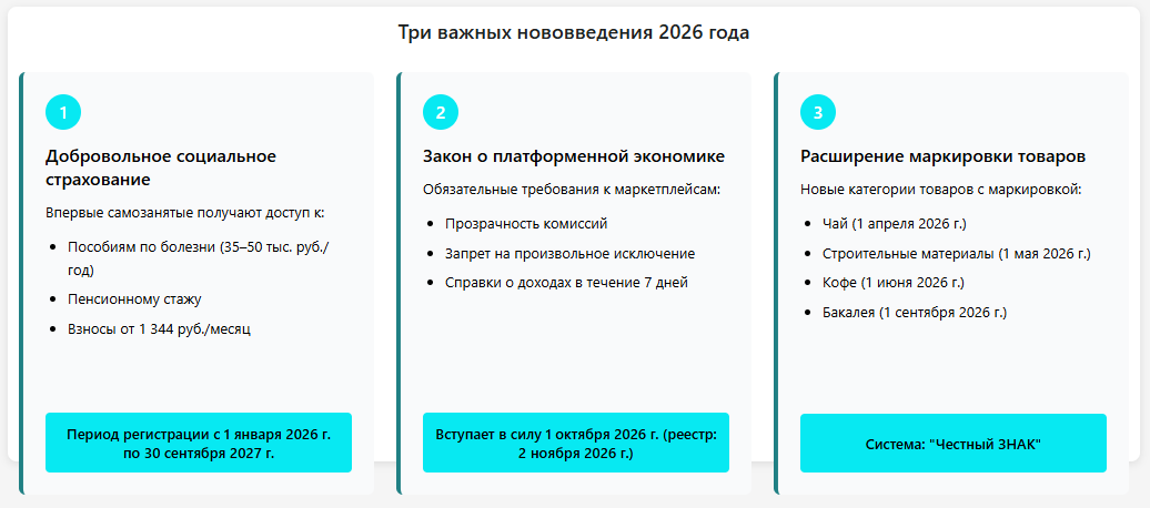 Как видим, базовые условия режима НПД остаются неизменными. Но зато изменяется все вокруг, «экосистема» самозанятых. В 2026 году заработали три нововведения от государства: социальные гарантии самозанятым; платформенная экономика с четкими нормативными требованиями; система маркировки товаров с новыми категориями продукции. Каждое из этих изменений значимо само по себе, но вместе они означают фундаментальный переход к контролируемой и социально защищенной экономике.