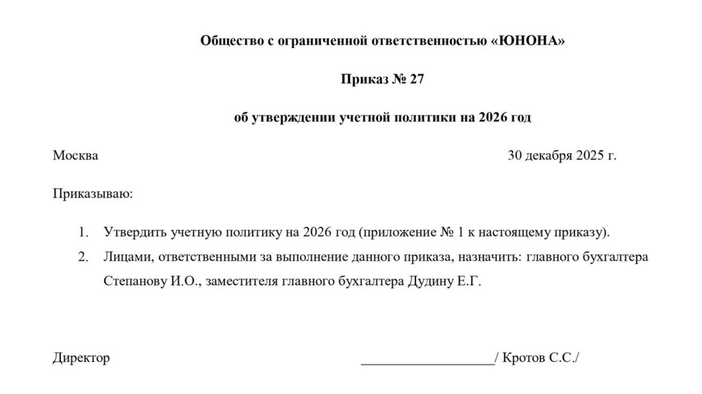 Согласно пункту 8 Положения по бухгалтерскому учету (ПБУ) 1/2008, учетную политику необходимо оформить организационно-распорядительным документом. На практике компании издают приказ об утверждении учетной политики за подписью руководителя. Документ составляется в свободной форме, но обязательно должен содержать номер, дату, подпись директора и перечень лиц, ответственных за разработку.