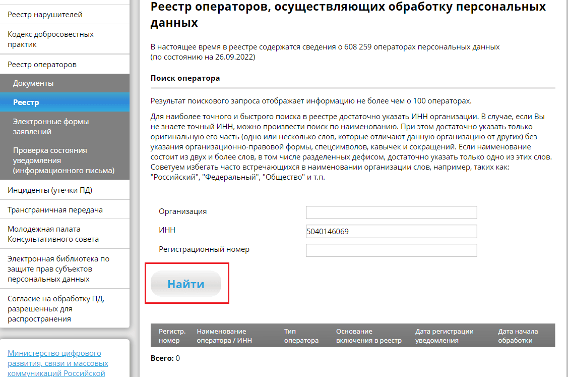 Шаг 1. Проверить наличие своей организации в реестре операторов на сайте Роскомнадзора. Это можно сделать по ИНН или названию.