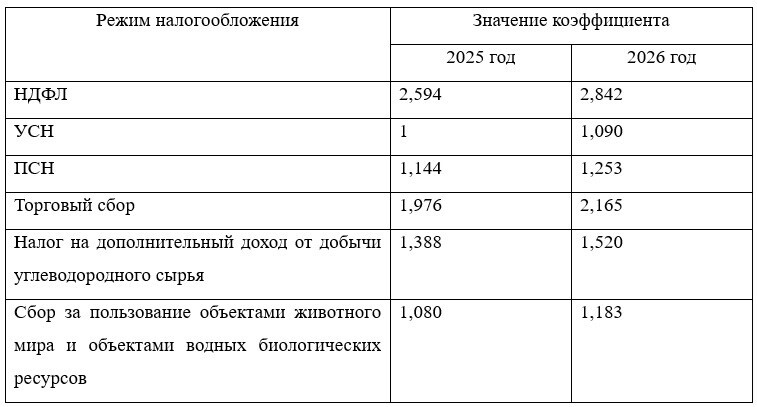 Для сравнения: в 2025 году коэффициент-дефлятор для НДФЛ составлял 2,594, для УСН применялся коэффициент 1,000 (фактически без индексации), для ПСН — 1,144, для торгового сбора — 1,976. Рост коэффициентов составил от 6 до 10 процентов в зависимости от вида платежа.
